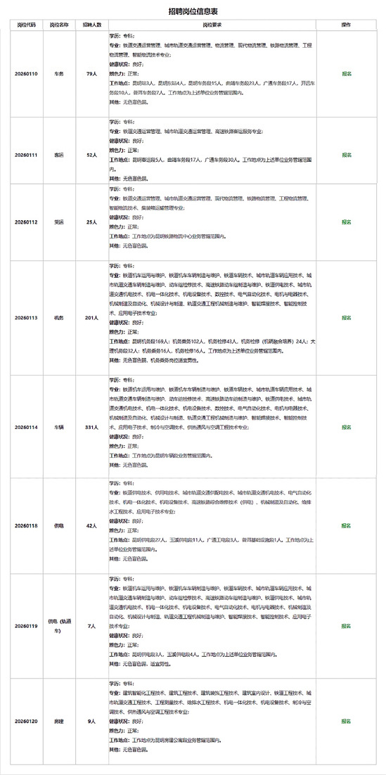 5.素质能力适应招聘岗位工作要求,服从企业对岗位、工作地点的安排和调整,新录用毕业生全部安排在中国铁路昆明局集团有限公司所属单位操作技能岗位。