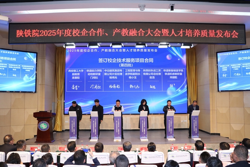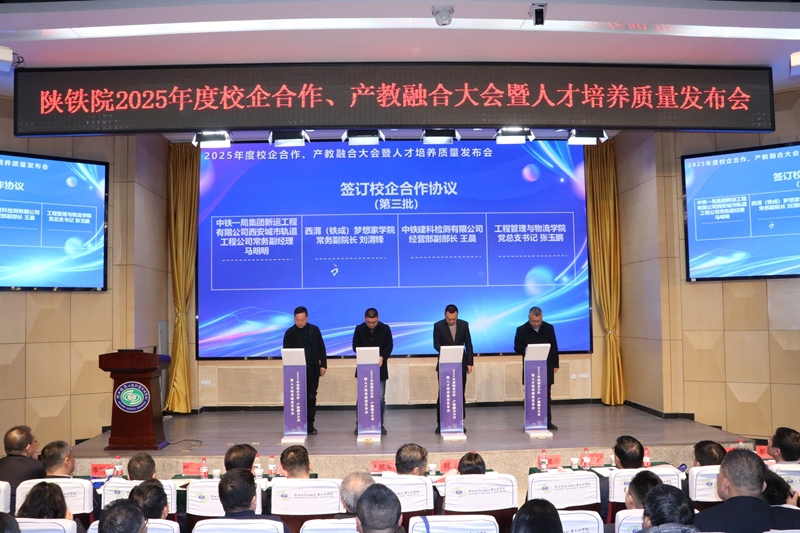 1月13日下午,学校在高新校区博爱厅举行2025年度校企合作、产教融合大会暨人才培养质量发布会。会议以“校企携手育英才 产教融合创未来”为主题,旨在总结办学成果、研判发展形势、深化多方合作,共同推动职业教育高质量发展。陕西省教育厅、陕西省人社厅、渭南市人民政府相关部门领导,中国铁路兰州局集团有限公司、中铁一局集团有限公司等80余家合作企业代表,省内外中学校长、家长代表、媒体记者及学校师生代表等500余人参加会议。学校党委副书记李林军主持大会。