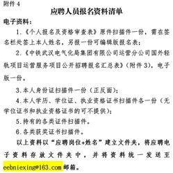 1.报名。应聘人员填写《个人报名及资格审查表》(附件2)和《中铁武汉电气化局集团有限公司运营分公司国外(中亚)轻轨项目运营服务项目公开招聘报名汇总表》(附件3),应聘岗位最多报一个,连同身份证、毕业证、高压证、低压证、消防设施操作员证、有限空间作业证、焊接与热切割和高处安装、维护、拆除作业证等各类证书扫描件统一压缩打包后发送到邮箱eebniexing@163.com,邮件命名:应聘岗位+姓名;